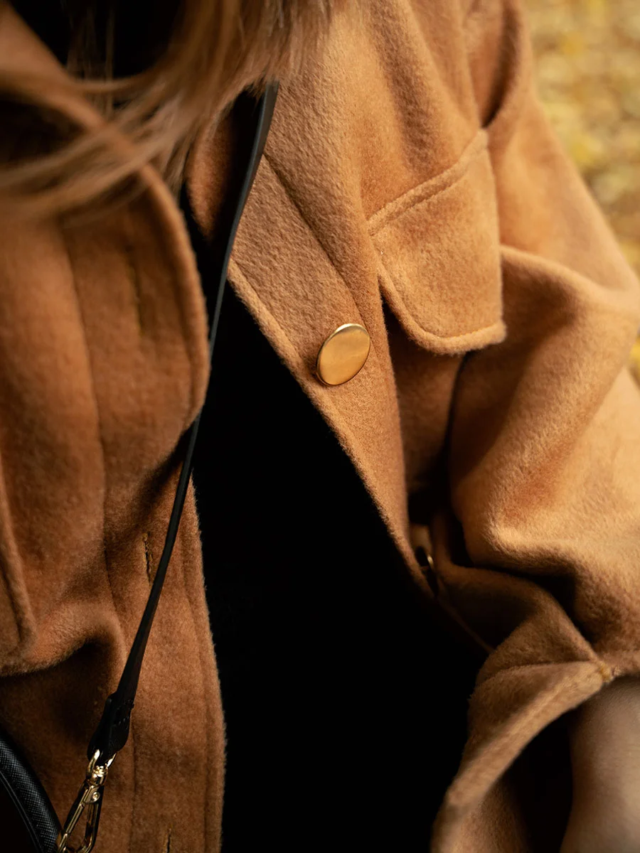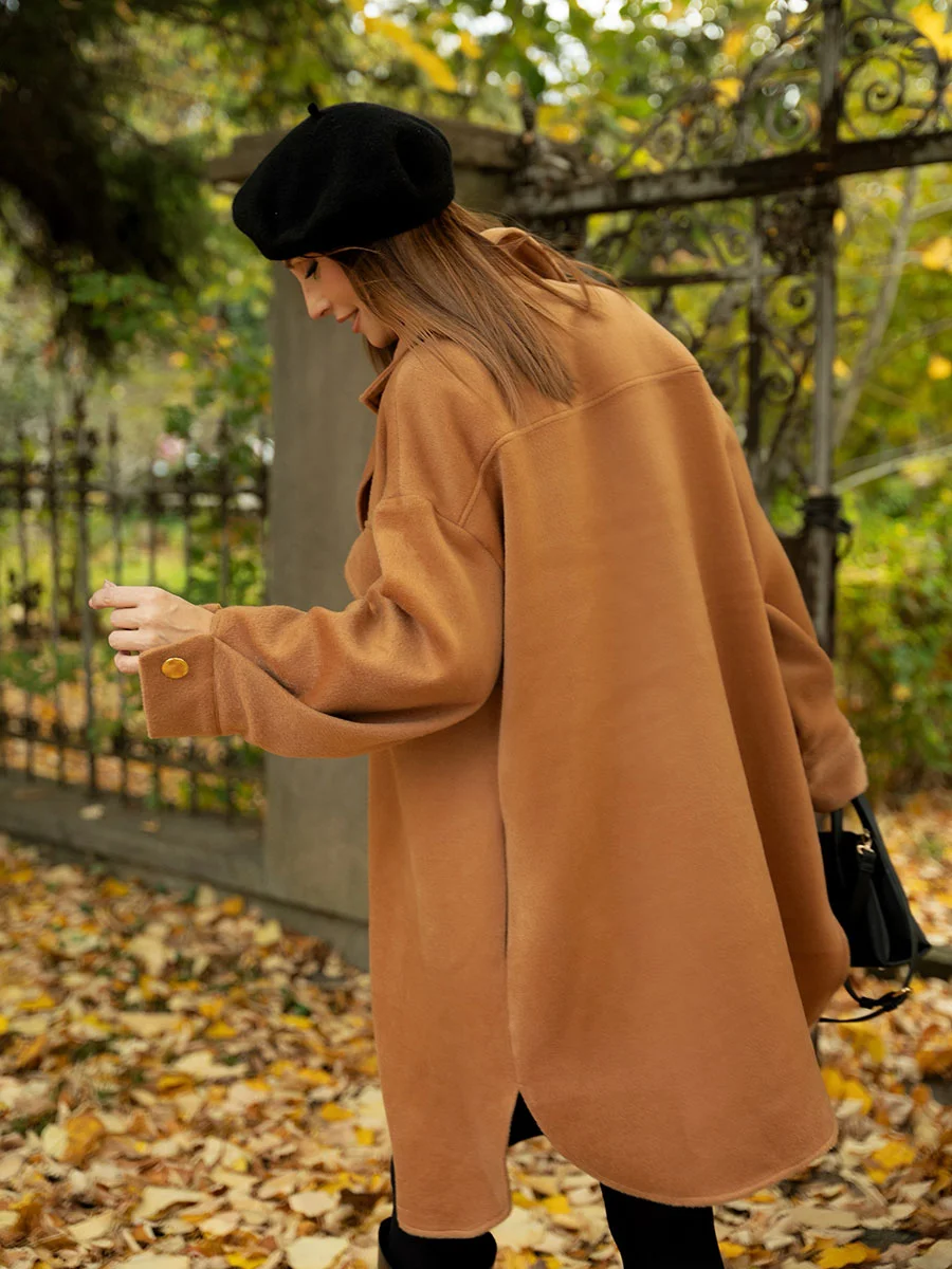 Zimski kaput/natkošulja od vune i kašmira pruža savršenu ravnotežu između udobnosti i luksuza. Oversize kroj donosi moderan i ležeran izgled, dok zlatni dugmići dodaju dašak sofisticiranosti.