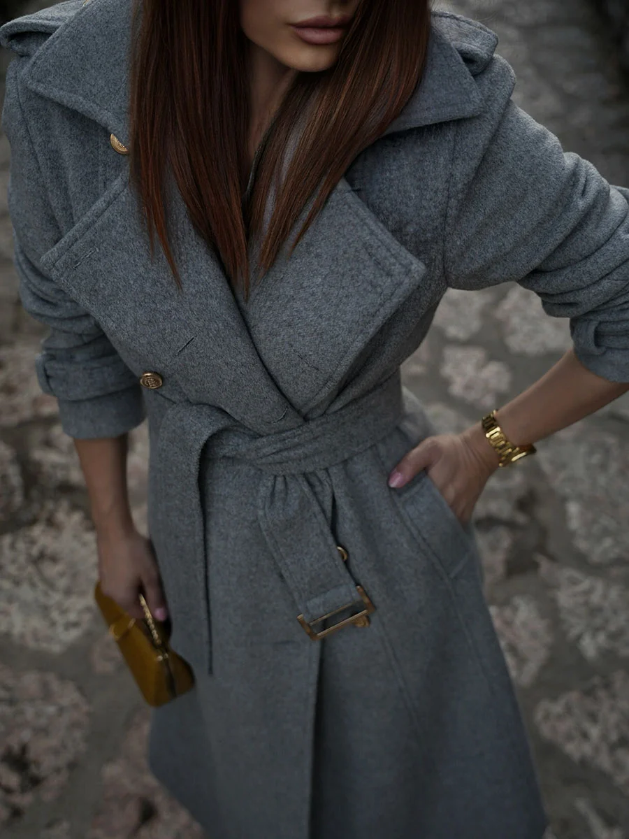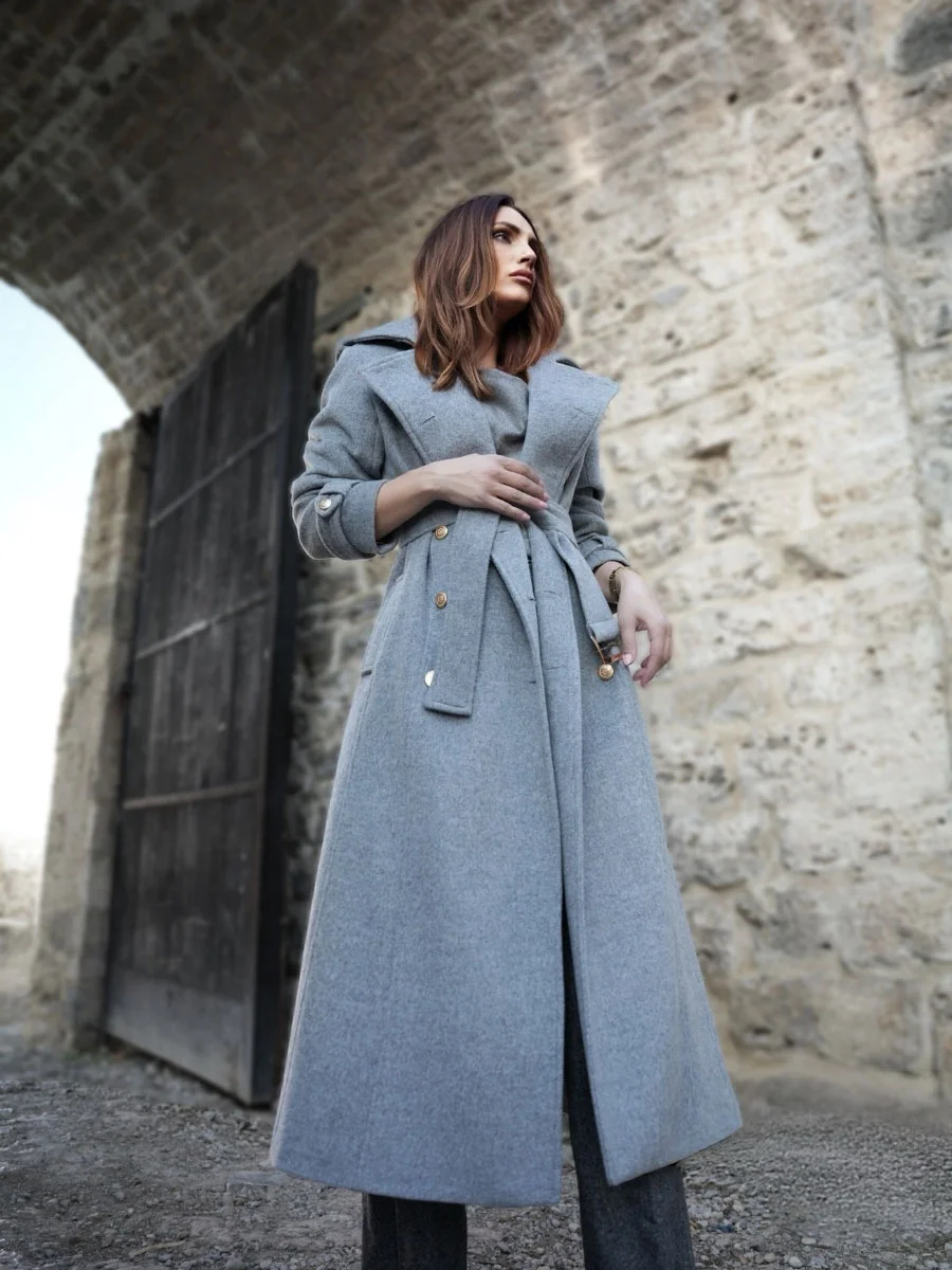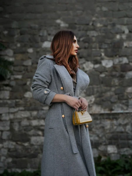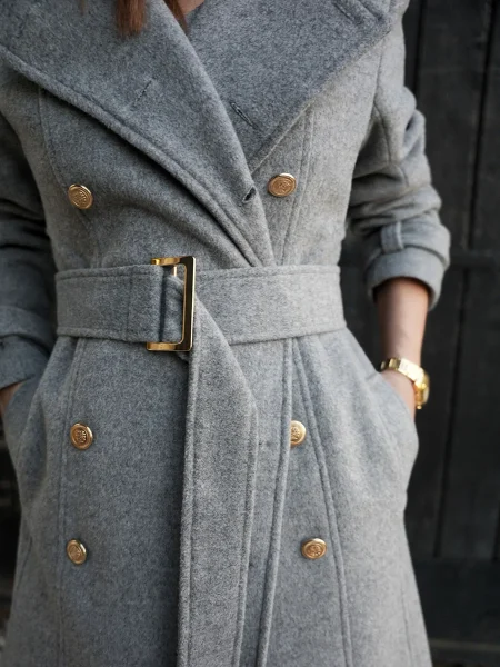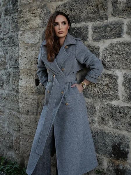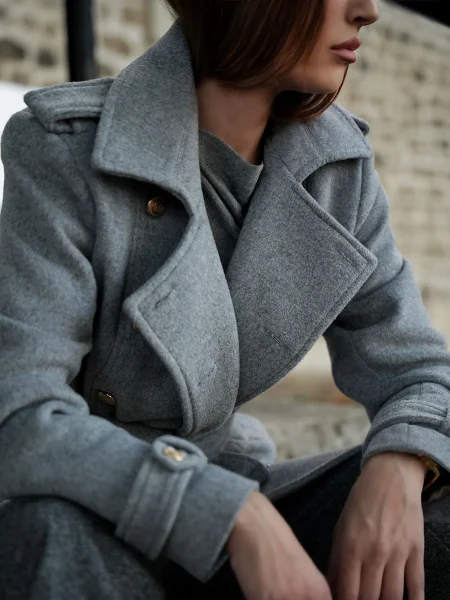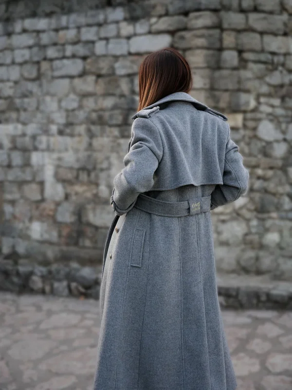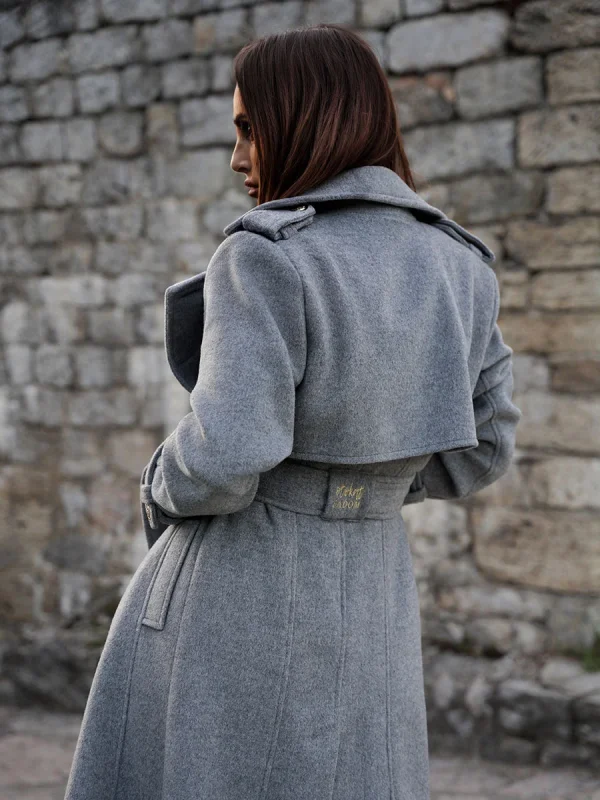 Klasičan i bezvremenski kaput, ključni je komad garderobe i ulaganje za cijeli život. Strukirani kroj koji prati liniju tijela i laska svakoj figuri, sa dvorednim kopčanjem sprijeda i pojasom u struku, naglašava ženstvenost siluete – što je i glavna estetska ideja ovog modela.